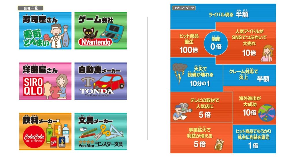 「株式ダーツゲーム」に関しては、クラスをグループに分け、それぞれが企業の経営者(※最大6社)となり、株主を増やしたり他社に投資したりすることで自社の利益を増やします。ゲームの流れでプレゼンも行うため、アクティブラーニングの授業にも活用でき、子ども達は体感することで、株式の理解を深めます。